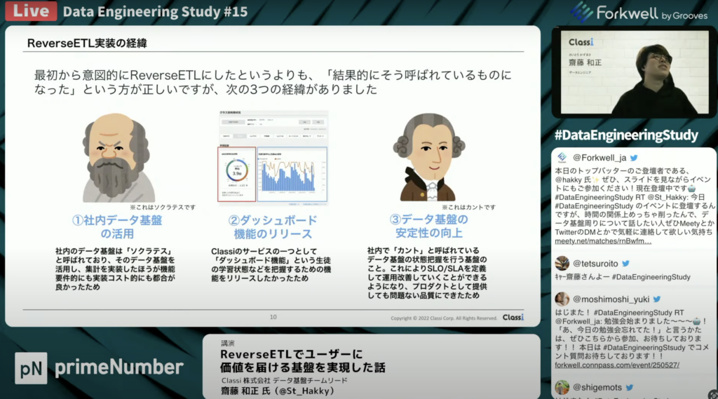 齋藤 和正氏:「①社内データ分析基盤である「ソクラテス」や②データ基盤の安定性向上のための監視基盤としての「カント」があり、③プロダクトとして実際に提供するという3つの背景に加えて、社内のデータ基盤の利便性及び品質向上の取り組みによって、ユーザー提供に十分な基盤になりました。また、データを集計することは「ソクラテス」が一部担っていたので、開発のリソースを考慮し、逆にAWSに書き戻すアーキテクチャにしようという意思決定が行われました。」