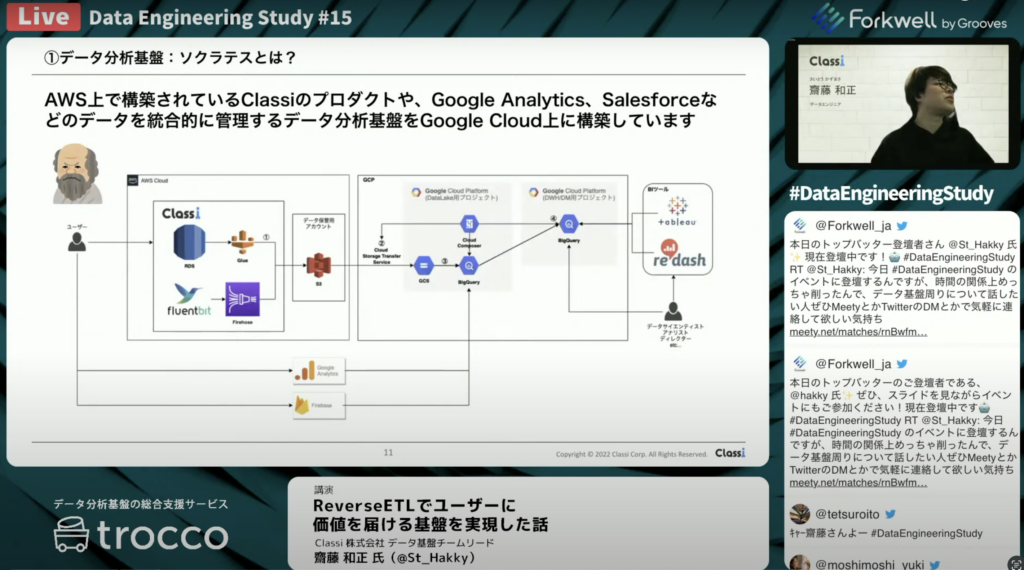 齋藤 和正氏:「ClaasiはAWS上で構築されており、Google AnalyticsやSalesforceなどのデータを統合的に管理するデータ分析基盤をGoogle Cloud上に構築しています。いわゆる、マルチクラウドなデータ分析基盤になっており、Tableauやredashを使ってデータを見る形になっています。」