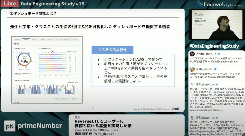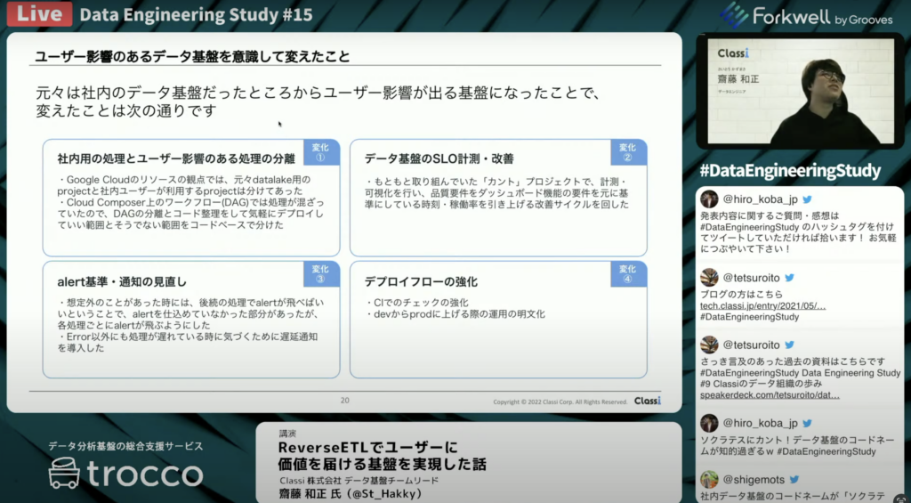 特に、Classiのデータエンジニアチームでは、データ基盤のチーム開発を2年ほどやっており、障害発生時のポストモーテムの実践や開発スプリントの実践をプロダクト開発と同じように行ってきました。「分析に止まらないデータ価値提供」を意識して、システム間連携におけるサービスレベルの担保に求めれることは通常のプロダクト開発と変わらず行ってきました。」