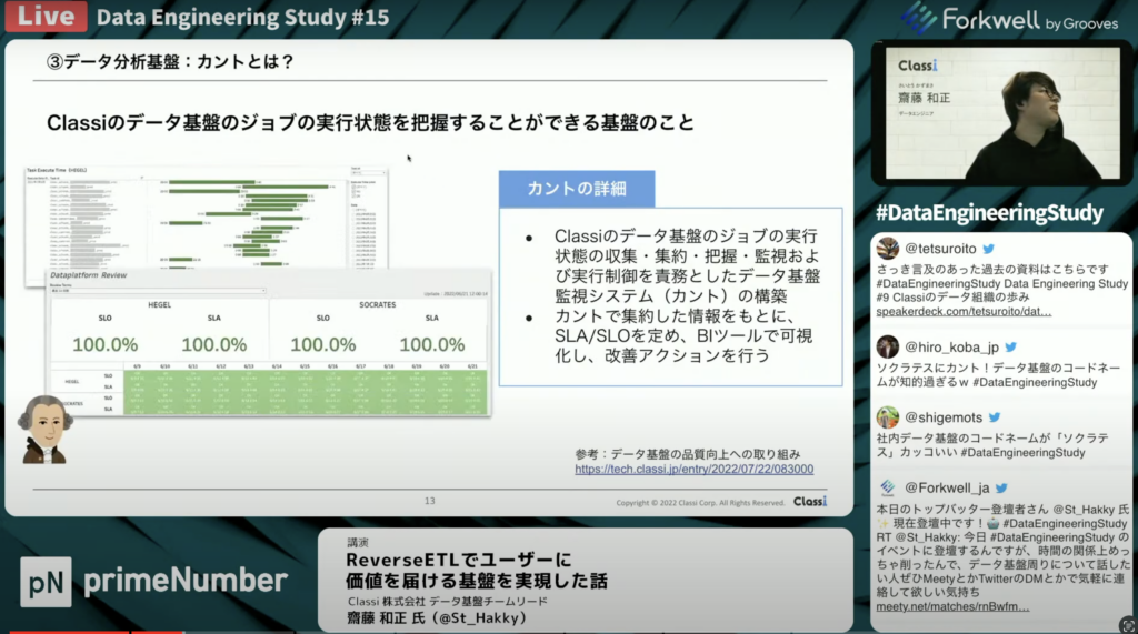 齋藤 和正氏:「カントはClassiのデータ基盤のジョブの実行状態を把握することができる基盤のことです。機能としては、「ヘイゲル」「ソクラテス」などのデータ基盤のコンポーネントごとにSLO/SLAを設定して、いつまでのどのジョブが終わっていないといけないかを計測したり、監視したりできる基盤になっています。また実行状態・実行時間も見ることができ、エラーを見ながら優先度を確認できる基盤です。」