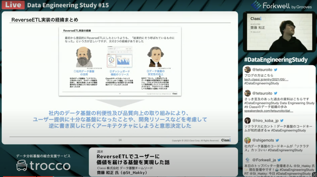 齋藤 和正氏:「2022年2月に、データAI部内のミーティングで、Modern Data Stackや前回のDESで取り上げたトレンドの部分、ReverseETLに限らずデータの価値を高めていけるデータ基盤を目指して、どういった取り組みをしていくかを発表しました。