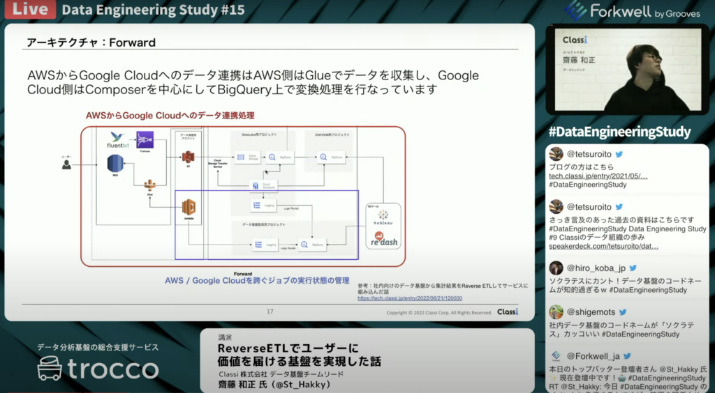 齋藤 和正氏:「ForwardはAWSでプロダクトを構成しています。Glueを使ってデータ連携をし、S3上に一度データを連携して、そこからCloud Composerを使ってデータマートを作っていく流れになっています。