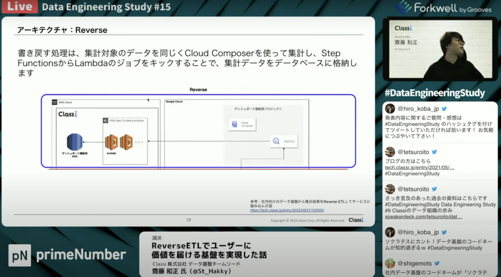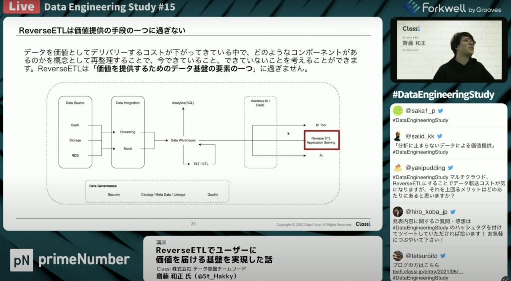 齋藤 和正氏:「アーキテクチャの全体像としては下側がForwardで、通常のデータ基盤の構築の流れになっており、上側がReverseで、書き戻しにいくところになります。」