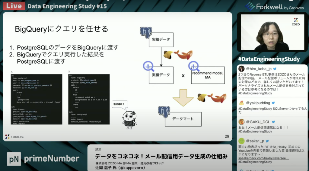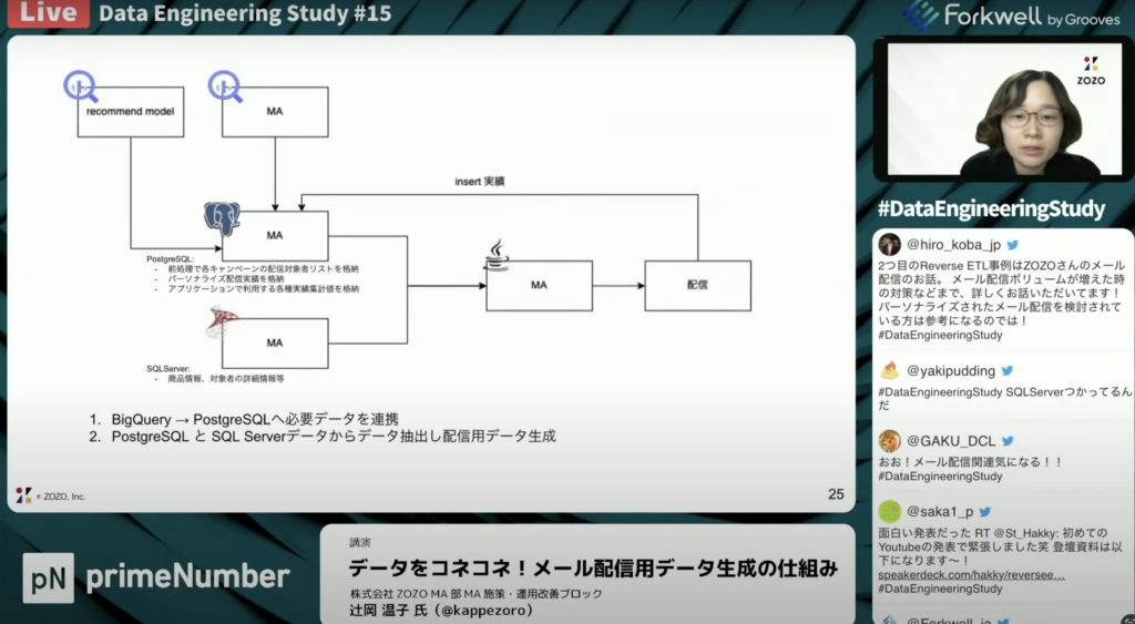 辻岡 温子氏:「BigQueryのデータは一度Postgre SQLにデータを渡し、パーソナライズ配信はPostgre SQLとSQL Serverのデータを使ってcsv出力して配信する仕組みになってます。SQL Serverは商品やユーザー情報等が入っていますが、Postgre SQLにはそれ以外のパーソナライズしたデータが入っています。BigQueryなどの基幹データ以外の連携するデータや実績のデータであったり、この箇所の手前でアプリケーションが別で動きますが、対象者を最適化して抽出する処理がのデータがここに入っています。」