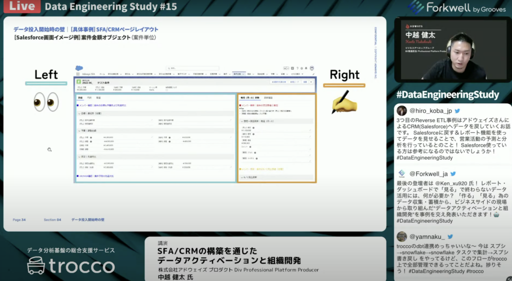 中越 健太氏:「左側は様々なところから収集してきたデータをアウトプットする形になっていて、Salesforceでは主には右側で記録を行う形を各オブジェクトごとにレイアウトを意識して作っています。利用者側としては、各オブジェクトごとに左側でデータを見て右側の方で入力するというところを徹底して構成されています。