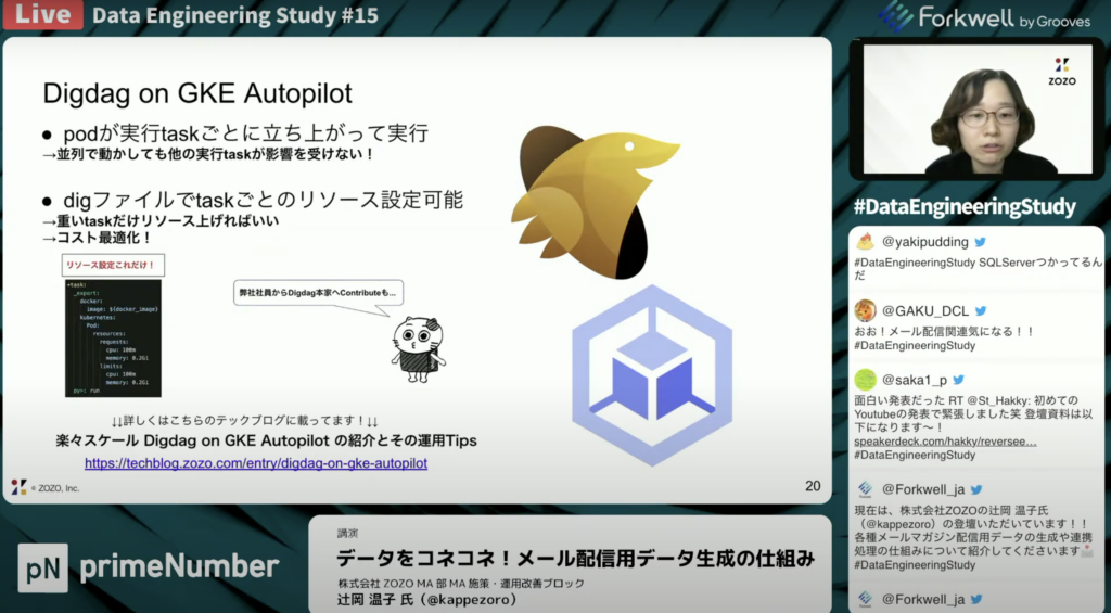 辻岡 温子氏:「Google Kubernetes Engine(GKE)上で動くDigDagの基盤です。利用側にとってメリットが大きく2つあります。1つはpodが実行タスクごとに立ち上がって実行できる点です。どれだけ並列で動かしても、単一インスタンスで並列処理を行ってリソースを食い合うことはなく、Digdagのほかの実行タスクが影響を受けないというメリットもあります。