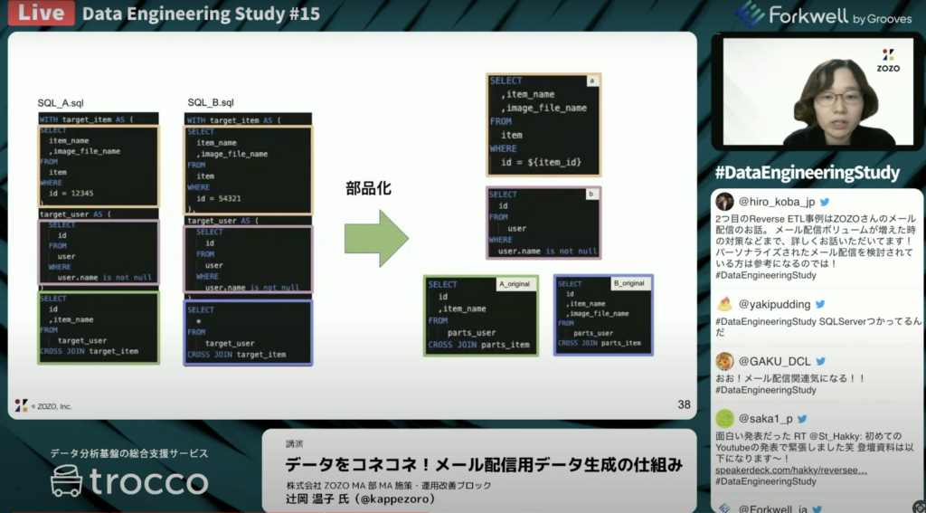 辻岡 温子氏:「なんか似ているけど、ところどころ違うクエリが散見されることがよくあると思います。そのような似てるけど所々違うクエリを細かく分割して、クエリ単位でファイルを分けて共通利用できる箇所は、同一ファイルを使ってクエリを実行するようにしました 。