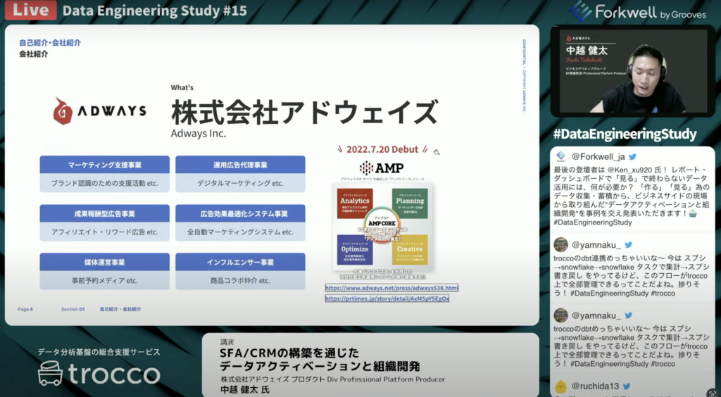 中越 健太氏:「株式会社アドウェイズはインターネットの広告代理店として、いくつかの事業を展開しています。AMPというシリーズで広告の方データ活用というところで、広告運用のシステムという形でいくつかシリーズ化など、様々なプロダクトを展開しています。」
