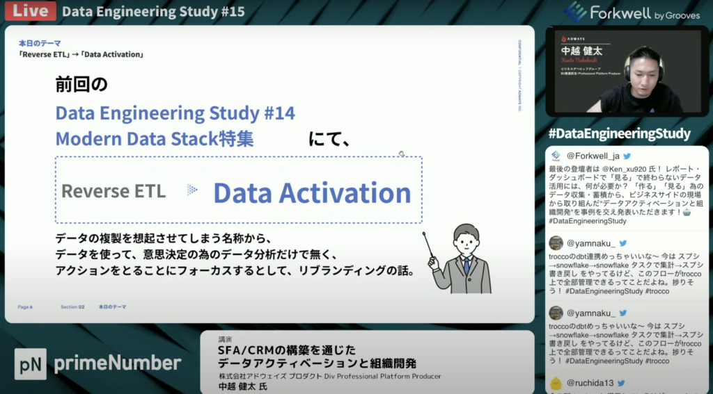 中越 健太氏:「前回の14回の発表の際に ReverseETLでデータの複製を想起させてしまうよねっていうのは、名称のところからあのデータを使って意思決定のためのデータ分析だけでなく、アクションをとることにフォーカスすることとしてみれば、リブランディングの話したところが最後のほうにあるので、それに付随するような内容を話します。」