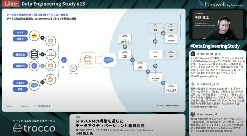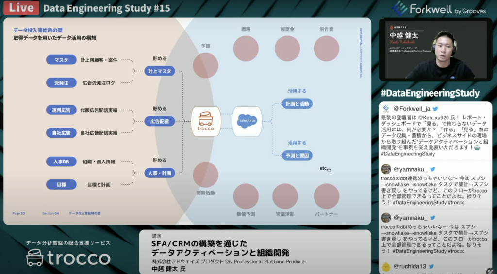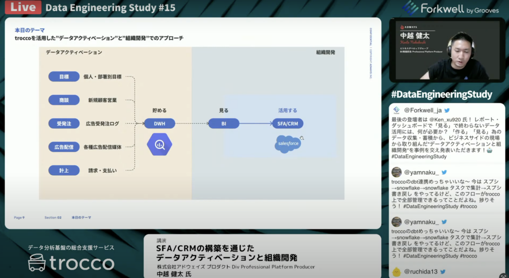中越 健太氏:「構想策定・SFA/CRMを構築してデータを流し込んでいくことを考えました。当社ではkintoneや広告配信のデータはBigQueryに溜まり、人事や目標の管理のデータはSalesfroceに溜まっている状態からスタートしました。それらをTROCCOを返してデータの運輸を行い、Salesforceの方に投入して計画と活動を促します。