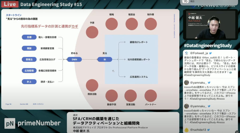 中越 健太氏:「大枠のイメージとしては、目標や商談等の点在したデータをDWHに返してBIやSFA/CRMにデータを流すという感じです。主に左側のデータアクティベーションという領域と右側の組織開発つまり、いかにしてその課題に適応させていくのかについてお話をさせていただければと思います。データは集まり、機能はできたけど、現場で活用に至らないといった壁を少し乗り越えるに至るまでのお話が本日のテーマになっています。」