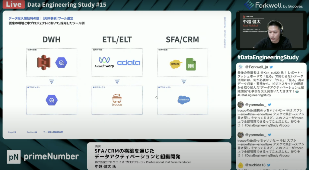 中越 健太氏:「1つはツール選定です。DWHはこれまでにAWSやBigQueryなどで分散をBigQueryに集約しています。ETL/ELTの領域に関しては、Asteria warpやCDataなどのコネクタを使っていましたが、今回のプロジェクトにおいてはTROCCOに集約しています。SFA/CRMの領域に関してはkintoneやスプレッドシートでかなり分散していたところをSalesforceで集約しました。