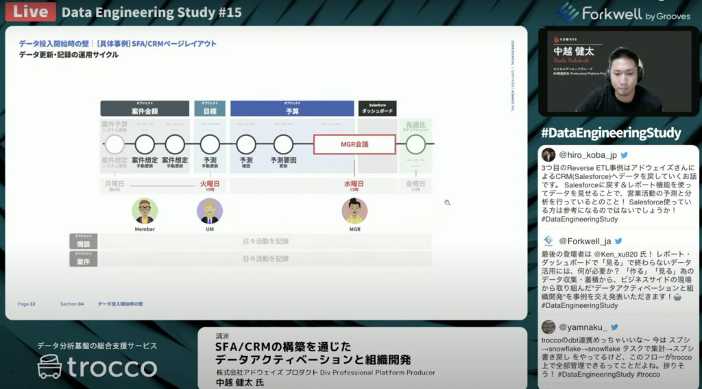 中越 健太氏:「Salesforceの運用のサイクルは、月曜日から水曜日にかけてメンバーユニットのマネージャーが、バトンを渡すような形で案件単位の数値の報告・個人別の数値・ディビジョン単位の数値の報告を取得したデータに対して、要因等を付け加えてバトンパスして行く形になっています。