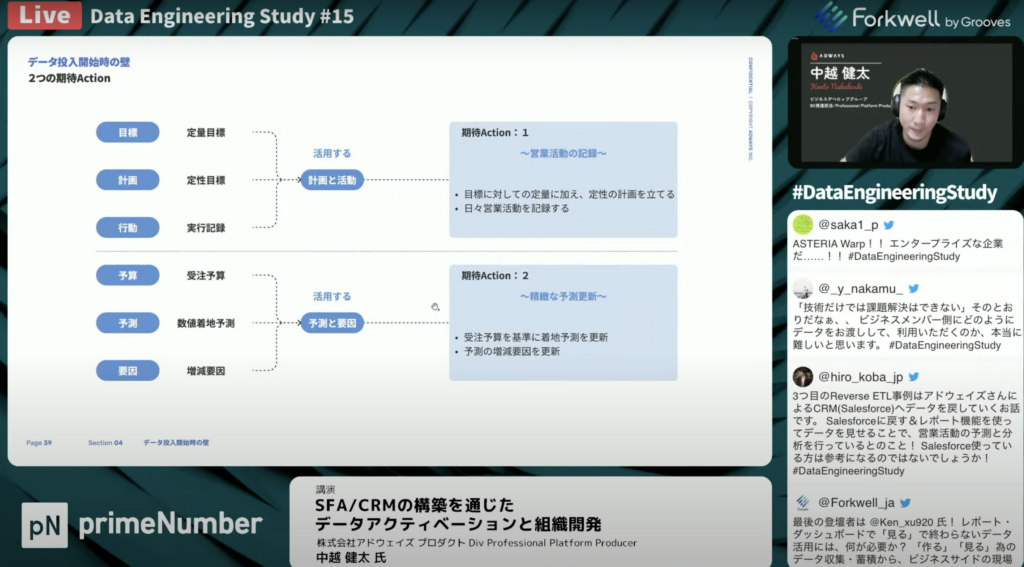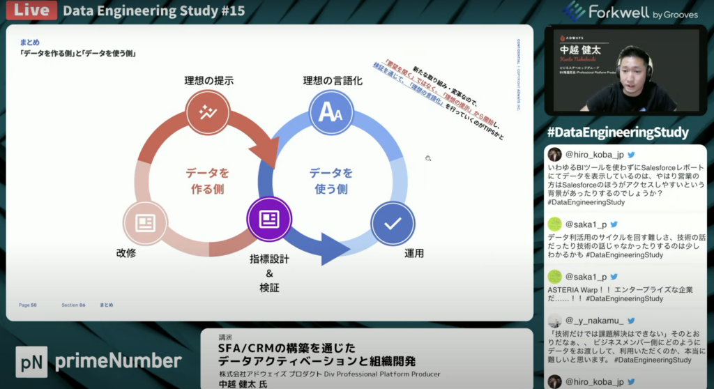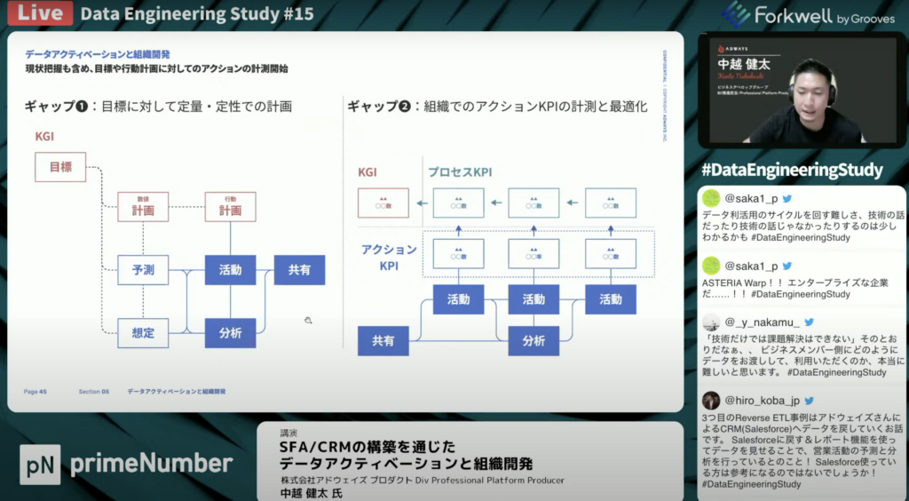 中越 健太氏:「データは元々、レポーティングのために蓄積されていたというところからスタートして、データ活用の構想策定・データ集約して、入力できるようにして計測ができるようになりました。やらされている感が否めないと言うところから、理想の言語化やギャップに対しての計画・行動を一緒に記憶して行くことを推進してきました。