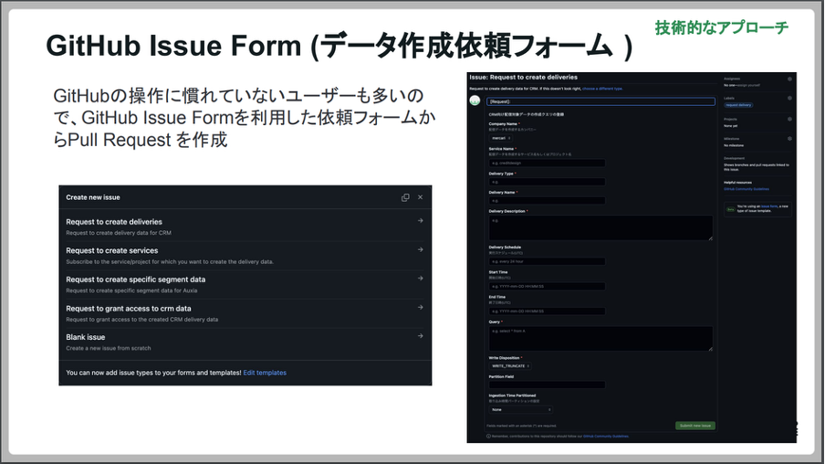 「担当者が入力フォームから必要な項目を入力して申請すると、Pull Requestを自動作成してくれる機能を提供しています。入力する項目は、データ作成情報の各項目やクエリです。GitHubのIssue Form上で簡単な入力チェックもできるため、記述漏れもある程度は防ぐことができます。」