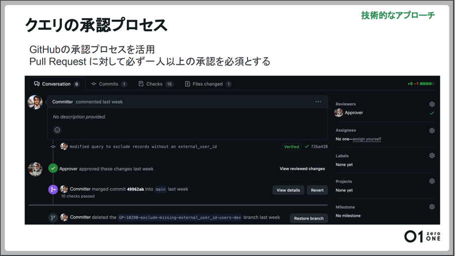 クエリの承認プロセスは、GitHubの仕組みをそのまま利用しています。Pull Requestを確認し、データの作成内容が業務要件に合っているのかチェックし、問題なければ承認します。担当者以外で少なくとも1人の承認が必要です。