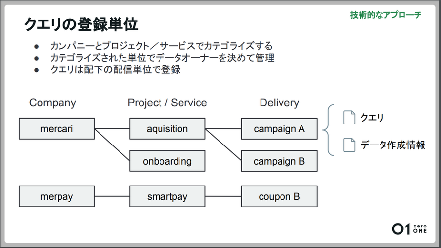 クエリとデータ作成情報は、その配下に配信単位で管理します。クエリごとにデータオーナーを決め、責任を持って管理するようにします。