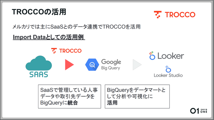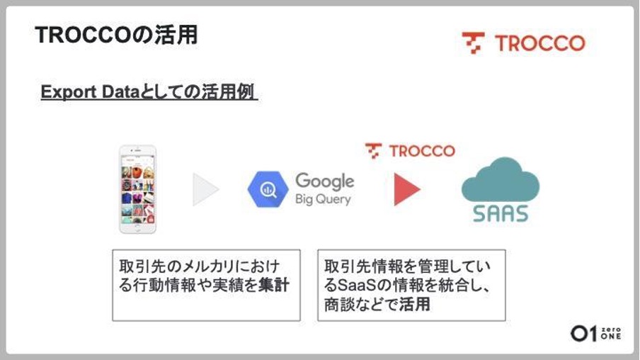 さらにメルカリ内の取引先に関する行動情報など、BigQuery上に集計されたデータを外部のSaaSに連携し、商談に活用するケースも増えているとのことです。このようにTROCCOはメルカリのビジネスの一部を支えるデータ連携に活用いただいています。