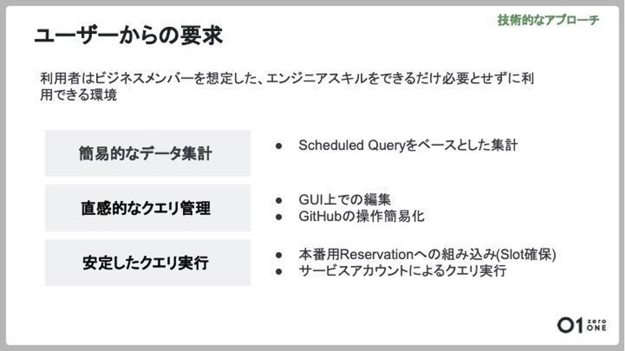 データ管理上で解決すべき事項に加え、データの使い勝手をさらに向上するためには、ユーザーからの要求も実現する必要があります。データ利用者のほとんどがエンジニア以外のロールであるため、エンジニアスキルをできるだけ必要とせず、簡単に利用できるものである必要があります。