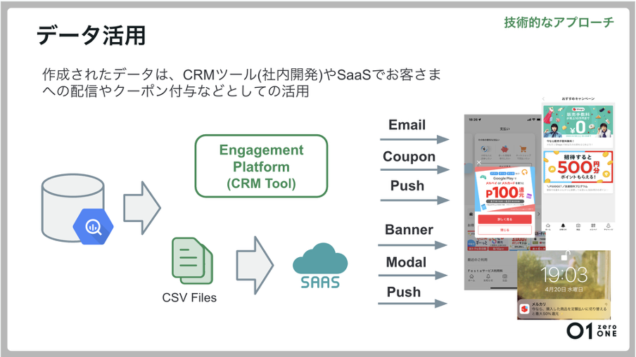 作成されたデータは、CRMツールやSaaSを介し、Eメール通知やクーポン付与、プッシュ通知、キャンペーン配信など、CRMの顧客アプローチに活用されています。