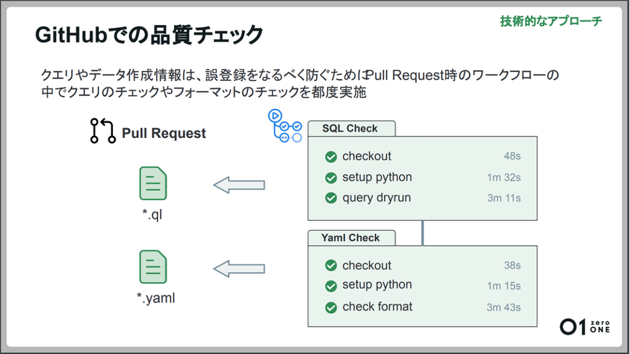 「担当者が作成するクエリやデータの作成情報は、誤登録をなるべく防ぐためにクエリの実行チェックと、フォーマットチェックをPull Request作成時に実施しています。クエリの実行チェックでは『文法に間違いがないか』『実行可能か』とチェックを実施します。