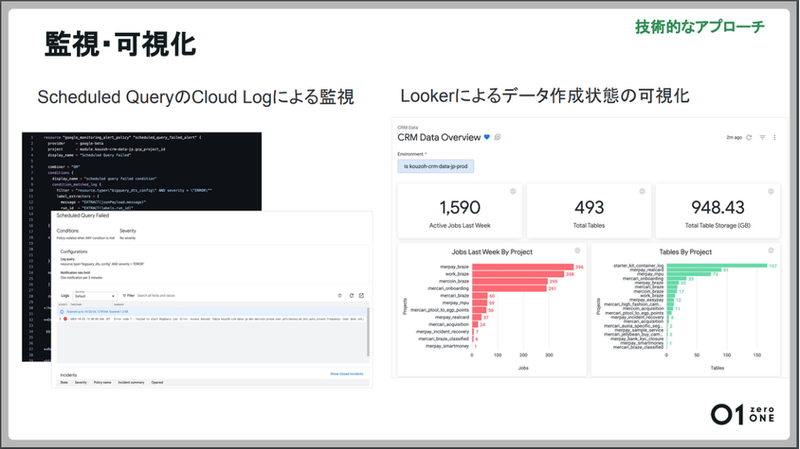 「Scheduled QueryのログをGoogleのCloud Logで監視し、エラー時にはSlackに連携するようにしています。データの作成状況を可視化し、ジョブの実行状況やテーブル作成状況をダッシュボードで確認できるようになっています。ストレージされているデータ量やクエリの負荷はコストに返ってくるため、これらの可視化は非常に重要です」(田中氏)