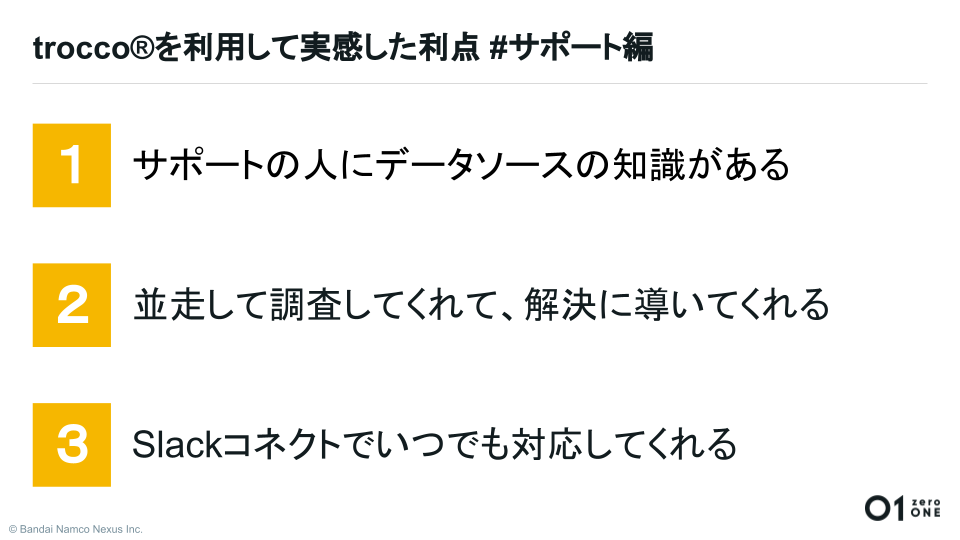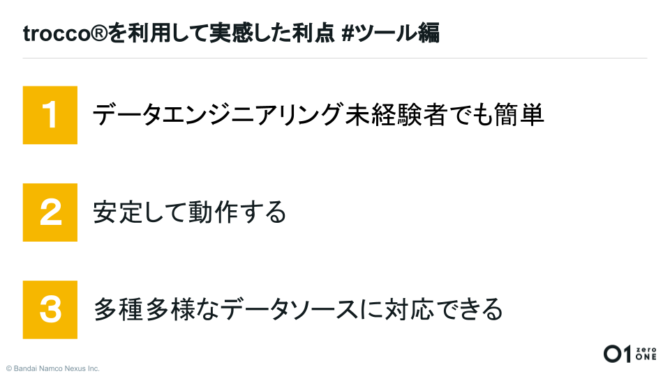 加えて、実際にサポートを受けて実感した、TROCCO®というサービスの利点を3つまとめました。」(吉村氏)