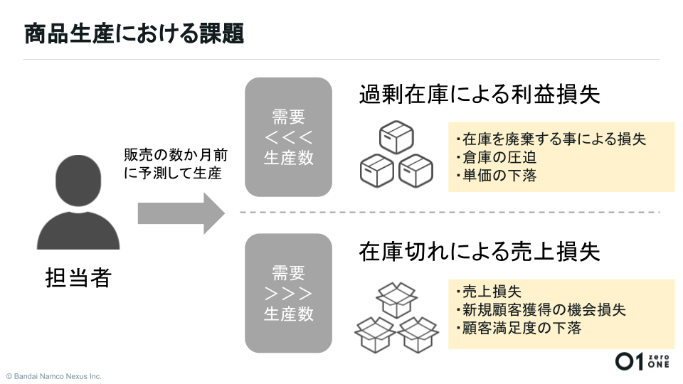 解決した課題:商品の生産決定と生産完了まで数ヶ月のタイムラグがあるため、需要予測を見誤ると過剰在庫や在庫切れといった売上げの損失が起きてしまう