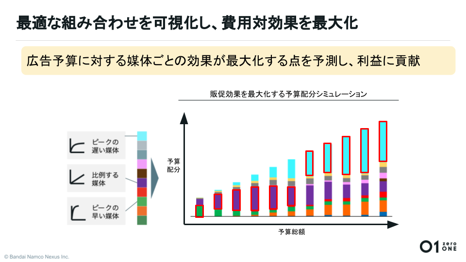 「まず、各広告媒体からデータ基盤へデータを取り込み、販促効果が最大化する予算配分のシミュレーションを行います。その結果を広告担当者に伝える際、弊社では分かりやすくするため、数字だけでなく、グラフ化して提供しました。結果、少ない予算で最大のプロモーション効果が得られるような広告出稿ができています。