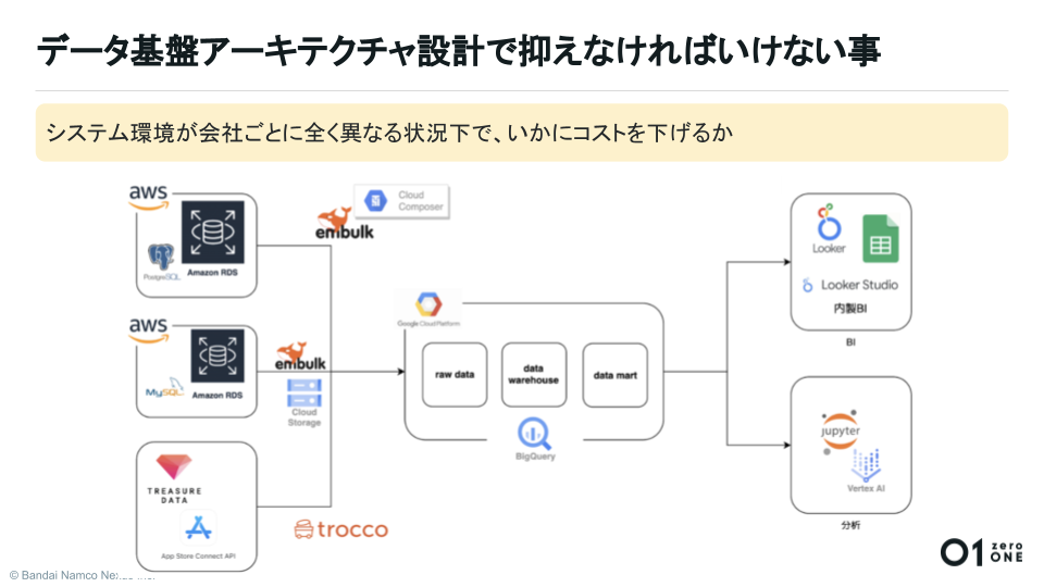 データ組織の“連合軍”が構築したデータ基盤アーキテクチャの設計で抑えなければならなかった課題を吉村氏は「システム環境やデータソースがグループ会社ごとに全く異なる状況下で、いかにコストを抑えつつ多様なデータソースを集約していくか」だったと語りました。