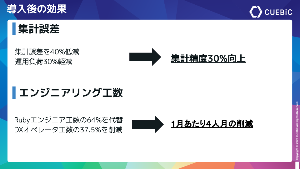また、コストセンター化していたエンジニアリング工数も、自動化やローコード化によって、8人月から4人月まで半減できました。これはただの削減ではなく、ビジネス側の要求に柔軟かつスピーディーに応えられる環境であることを意味します。