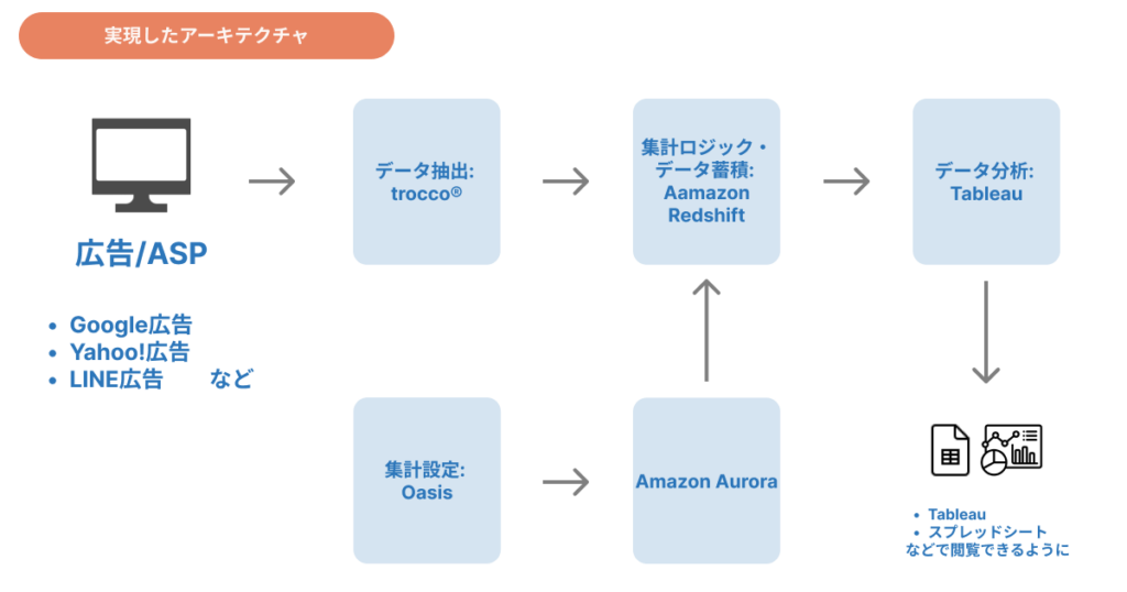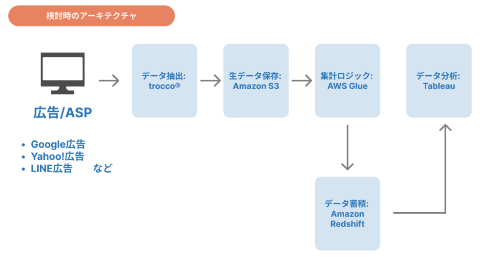 広告やASPから取得したデータを受け取るフロントに「TROCCO®︎」を配置し、データウェアハウスにはAmazon Redshiftを選定。データの集計や整形処理には、AWSアプリケーションを駆使し、集計したデータの分析には引き続きTableauを使用することになりました。このアーキテクチャは早期に実現することができたものの、新たな課題が発生したのだと尾﨑氏は当時の反省ポイントを挙げました。
