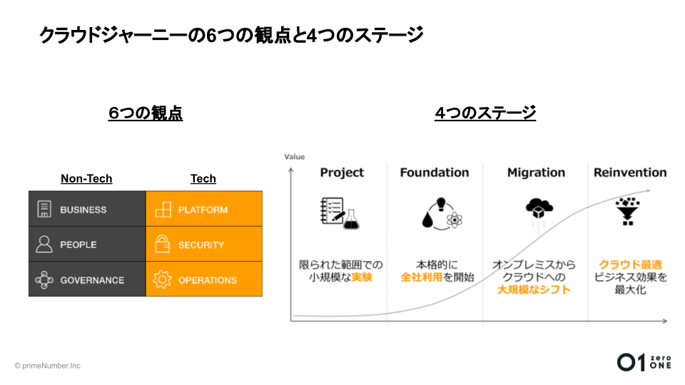 「AWS社では、Cloud Adoption Framework(CAF)というフレームワークをご用意しています。これはクラウドジャーニーにおける6つの観点と4つのステージを整理したものです。