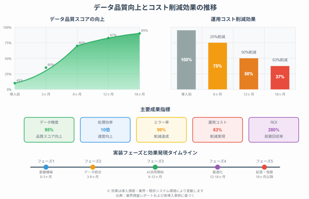 高品質なデータ基盤を築くには、データクレンジング、標準化、検証プロセスの自動化が欠かせません。これらを一体的に進めることで、データの信頼性を高め、AIモデルの安定性を確保できるようになります。投資回収の観点からも、初期段階でのしっかりとした品質基盤構築が何より重要なのです。