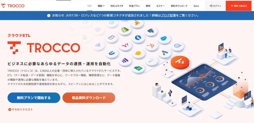 ETLツールの中にもさまざまなサービスがあり、それぞれが異なる特徴を持ちます。ここでは、クラウドETLツールである「TROCCO」の特徴を紹介します。