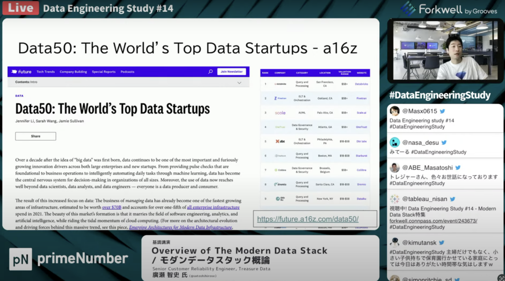 廣瀬 智史氏:「最新のModern Data Stackを確認したい場合や、どんな企業やサービスがModern Data Stackにカテゴライズされてされるのか等の深掘りを行いたい場合はこちらのサイトで確認することができます。