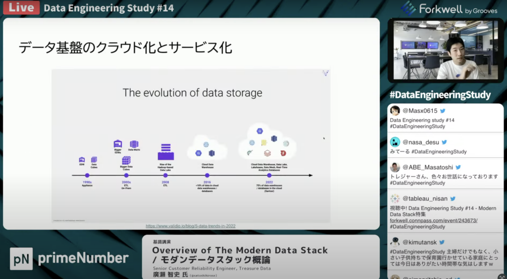 廣瀬 智史氏:「データ基盤のクラウド化とサービス化は近年の一番大きな変化だと思います。特にこの10年とか20年で分析基盤用のデータストレージシステムやDWHは発展・普及し続けています。