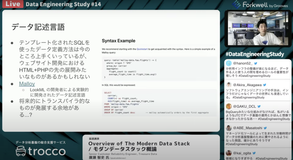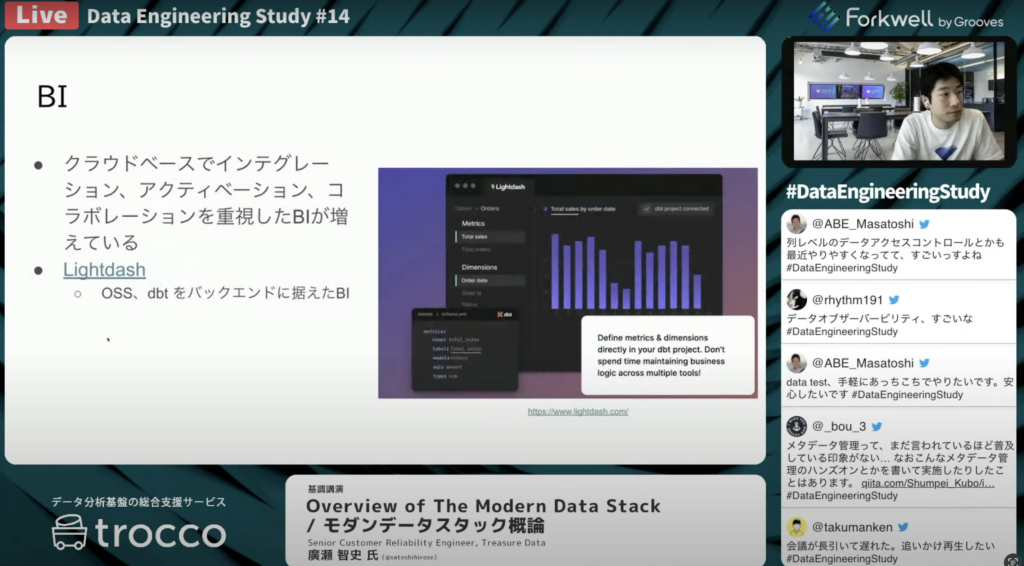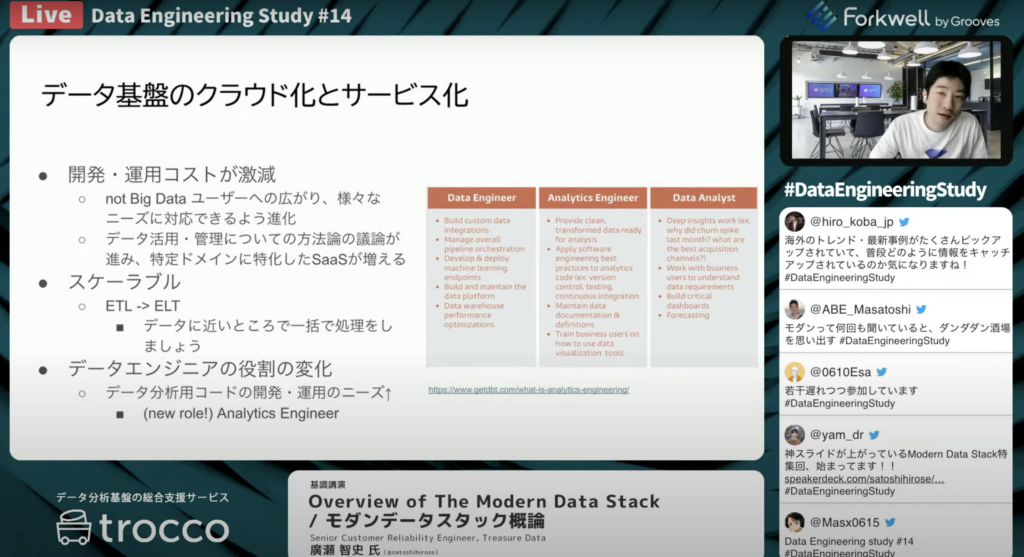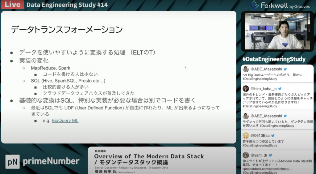 廣瀬 智史氏:Modern Data Stackと称されるようなトレンドを追いかけるのは楽しいものかなと思ってます。新しい仕組みを追いかけることで自分の思いつかないようなアイディアとかが存在することが確認できるので、勉強になります。