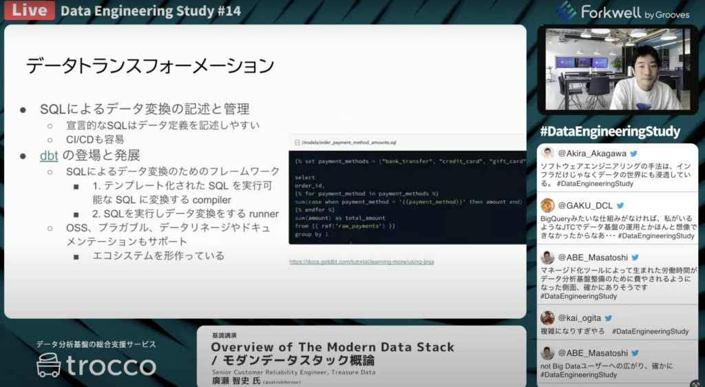 廣瀬 智史氏:「データトランスフォーメーションで使われてきたSQLは制限的でデータ提供しやすく、コードによる管理が出来てCI/CDの実践も容易だった点も、データ変換に使われるようになった理由だと思います。