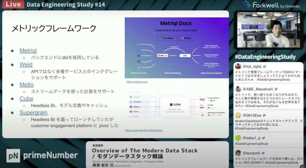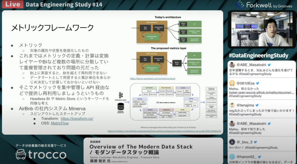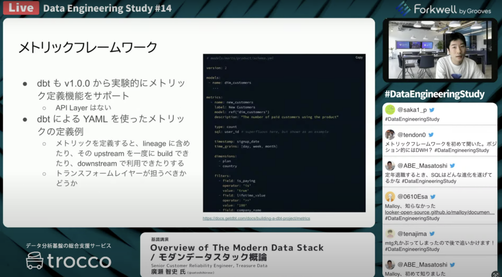 廣瀬 智史氏:「話に出てきたdbtのバージョン1.0.0から実験的にメトリック機能をサポートし始めていて、MinervaのようにAPIサービングレイヤーを持っているわけではなく、メトリックを提供するのはdbtが動作するDWHになります。