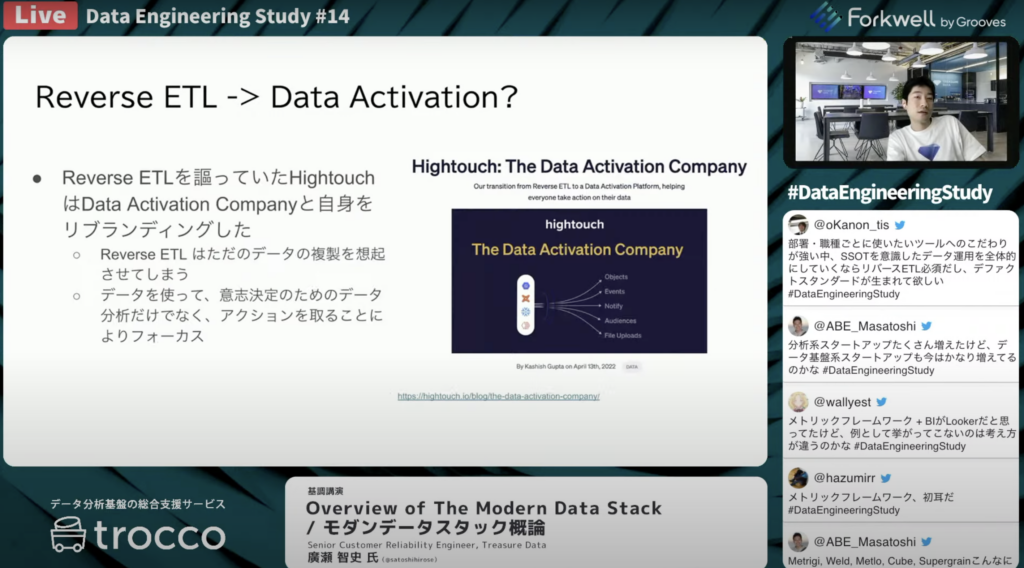 廣瀬 智史氏:「一方で、すぐさまジャンルとして確立したReverse ETLでしたが、Reverse ETLではなく、Data Activationと呼ぶ動きもあります。その流れから、Reverse ETLを謳っていたHightouchはData Activation Companyと自身をリブランドするブログを公開して宣言しています。
