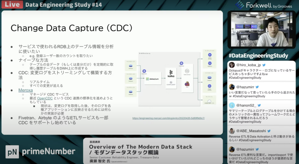 右の図はメルカリ社で実際に実装されたCDCのシステムのブログから引用したものです。DebeziumというCDCを実現するOSSのコネクターを使用し、データソースの変更ログをKafkaにストリームしてBigQueryで処理しています。Meroxaという会社は、最近オープンCDCといったCDC連携の標準化を進めるような動きをしています。」