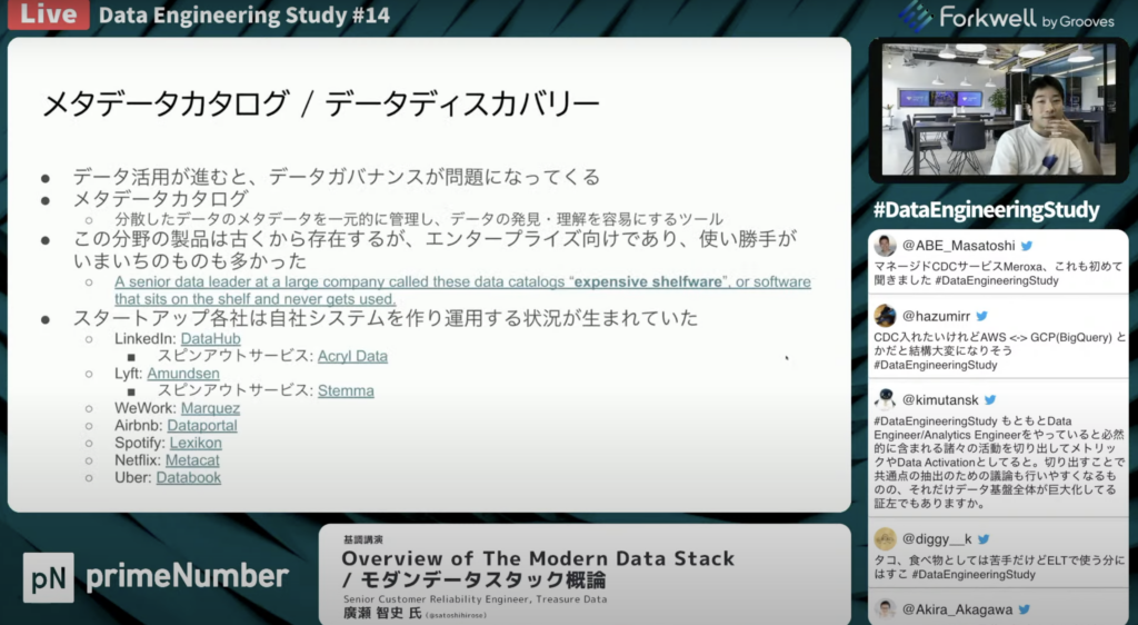 廣瀬 智史氏:「メタデータカタログは分散したデータのメタデータを一元的に管理して、データの発見・理解を容易にするツールです。この分野の製品は古くから存在していますが、エンタープライズ向けで使い勝手が悪いものが多いといった状況でした。そのような状況もあってスタートアップ各社は自社システムを作って運用し始め、一部はスピンアウトしてスタートアップが生まれる状況でした。」