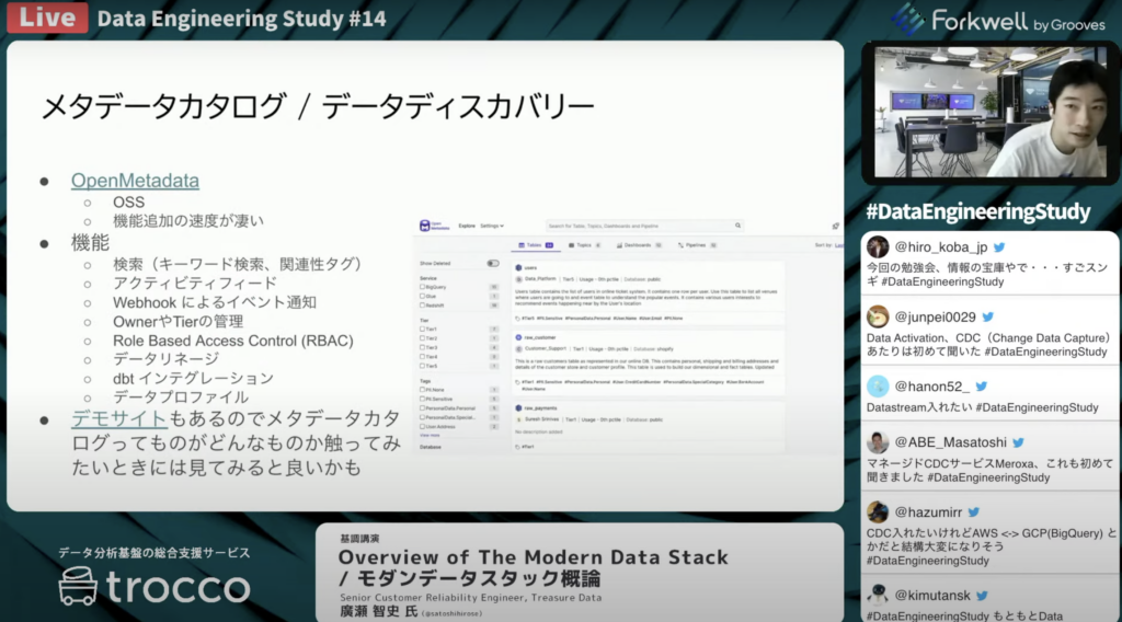 廣瀬 智史氏:「その中でもOpenMetadataというOSSのメタデータカタログソフトウェアは、後発ながらもすごい機能を実装しています。