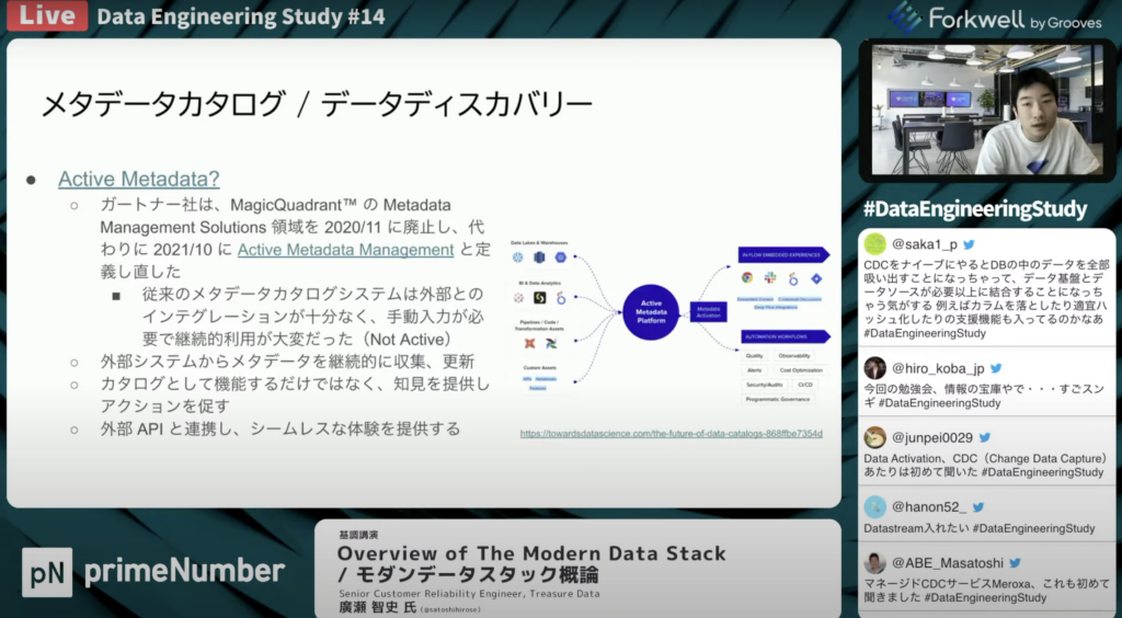 廣瀬 智史氏:「メタデータカタログに関するトピックとしては、Active Metadataというキーワードがあります。従来のメタデータカタログシステムは外部とのインテグレーションが十分でなく、手動入力が必要で継続利用が大変な状況でした。