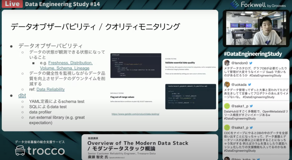 廣瀬 智史氏:「データオブザーバビリティというキーワードは観測性と訳されることが多く、データの状態を観測できる性質です。データの健全性を監視しながらデータの品質を向上させてデータのダウンタイムを削減することが必要だと議論が進められています。