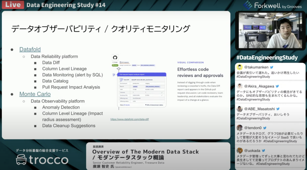 廣瀬 智史氏:「データオブザーバビリティに関連するサービスも作られており、DatafoldとMonte CarloというサービスはどちらもDWHのデータソースと連携して、データをプロファイルして監視・リネージしたり、データの状態を監視するようなサービスです。