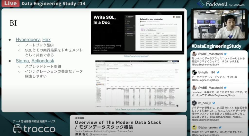 廣瀬 智史氏:HyperqueryとHexというサービスは、ノートブック型のBIツールと呼ばれていて、SQLに特化したjupyterに似たものです。右上の図がHyperqueryに関するもので、SQLで取得したデータをドキュメントして共有できるので、会社の社内情報共有に使うと書かれています。