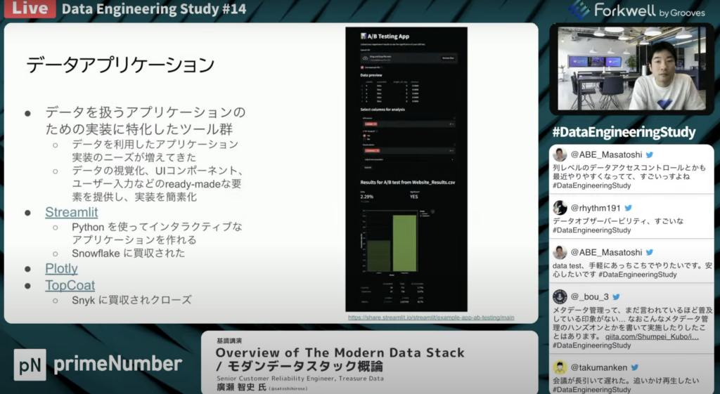 Snowflakeに買収されたSreamlitはpythonを使ってインタラクティブなアプリケーションをコンポーネントを組み合わせることでつくることができます。 右の図の例はA/B test の有意差があるかどうかをデータをアップロードすることで検証してくれます。