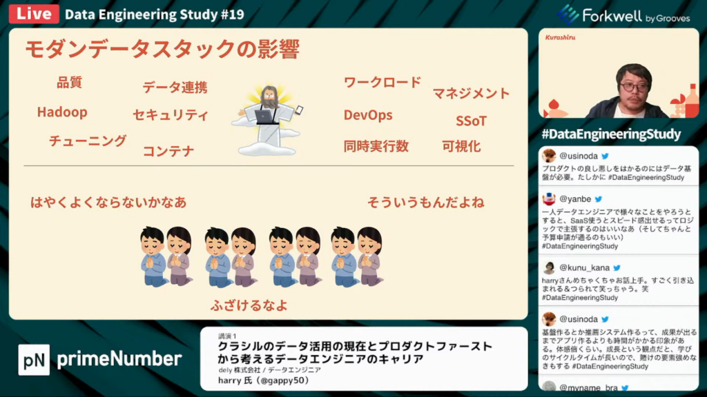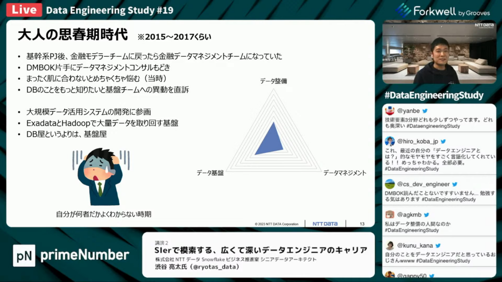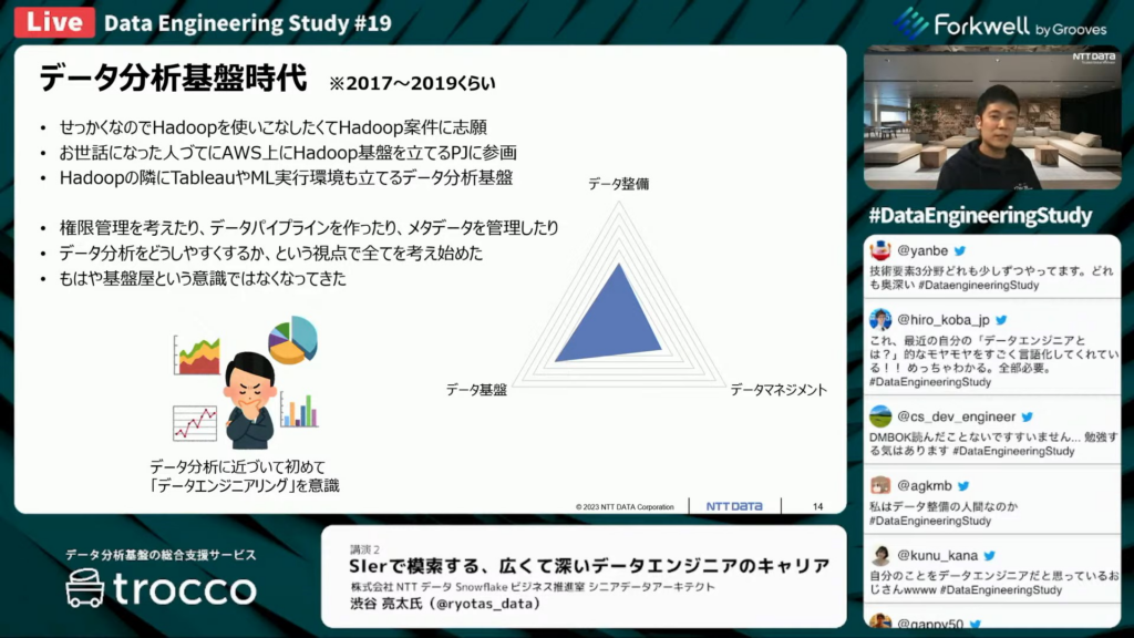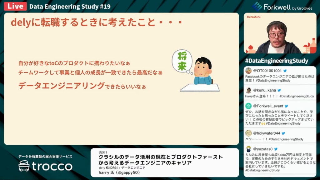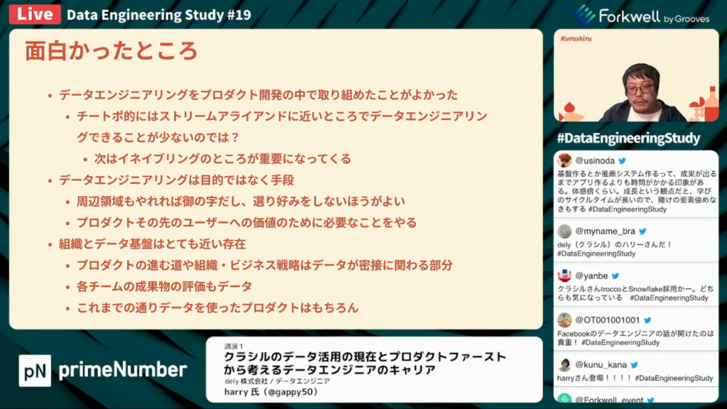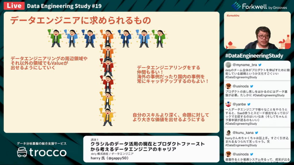 (会社のニーズと自分にできることを一致させることに)バリューがあるのは間違いないですが、その都度それ以外で必要なことはデータエンジニアとしてやれる状況を作らないと、自分の価値を見いだせなくなるのではないかとも思いました。